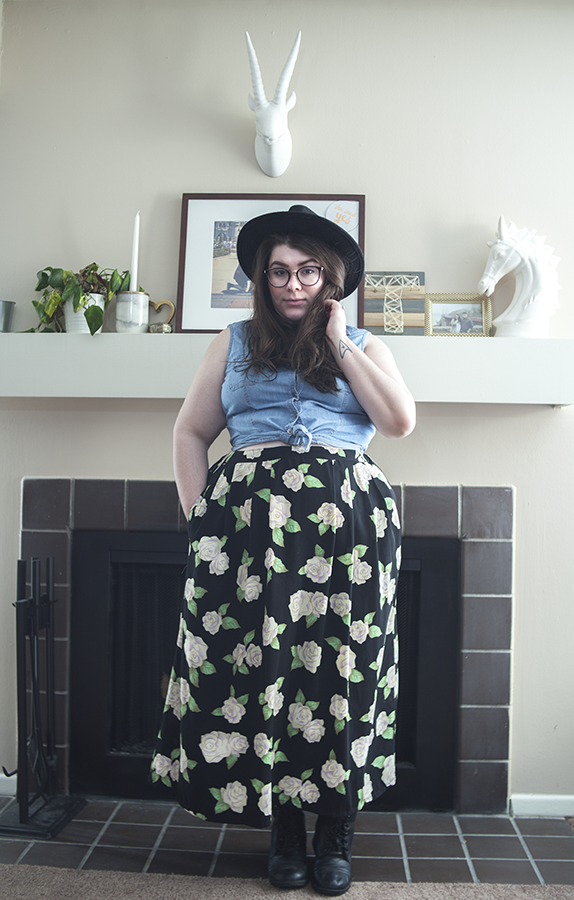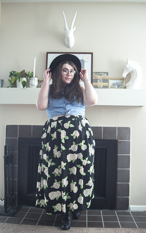 I swear, this skirt lends itself to so many styles! The black gives the skirt an edgy feel, so I paired it with a chambray blouse that I tied up, and a wide brim hat with combat boots for a 90's-inspired, not totally a witch look.