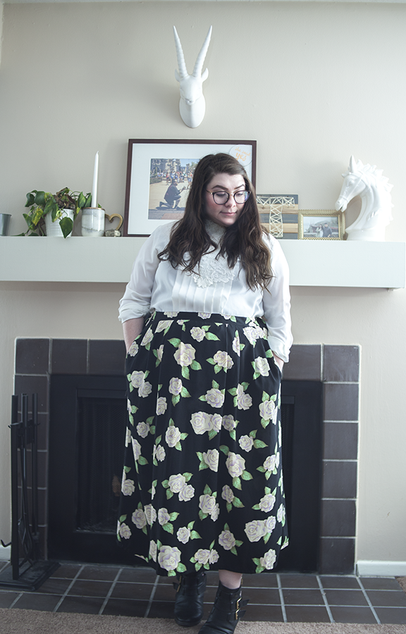 Floral skirts are the perfect addition to anyone's spring wardrobe! In this outfit, I styled the skirt with an ornate white blouse with the sleeves rolled up and lack heeled boots for a dramatic garden party look.