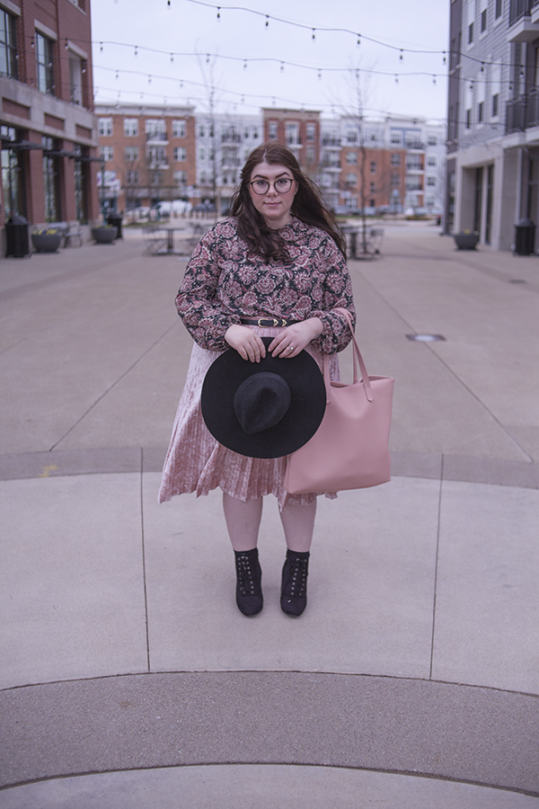 I love pink for Spring (obviously), so I wanted to match pink with pink and hints of black for a safe yet Springtime look. This paisley dress as a top is a perfect compliment to the velvet skirt, and the large black hat and heeled booties help balance the outfit out.