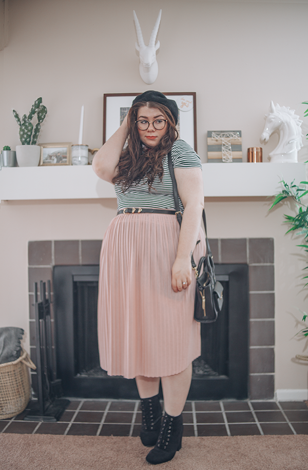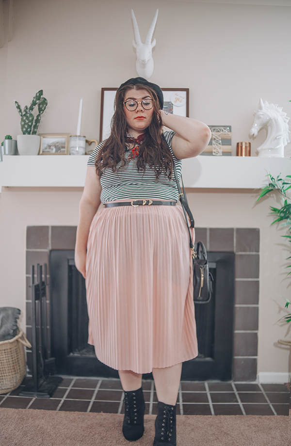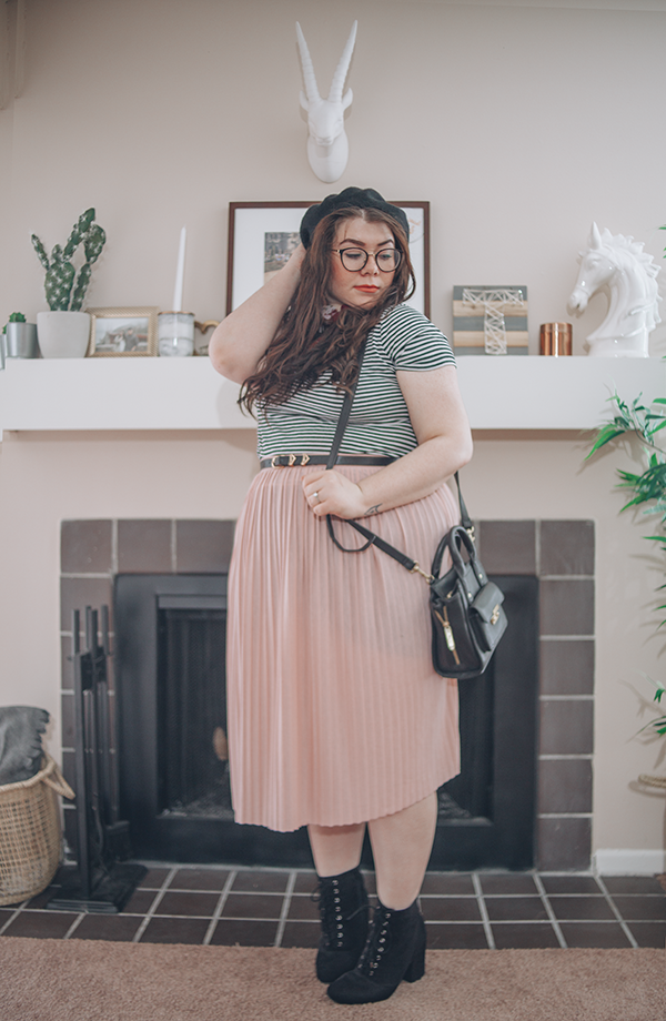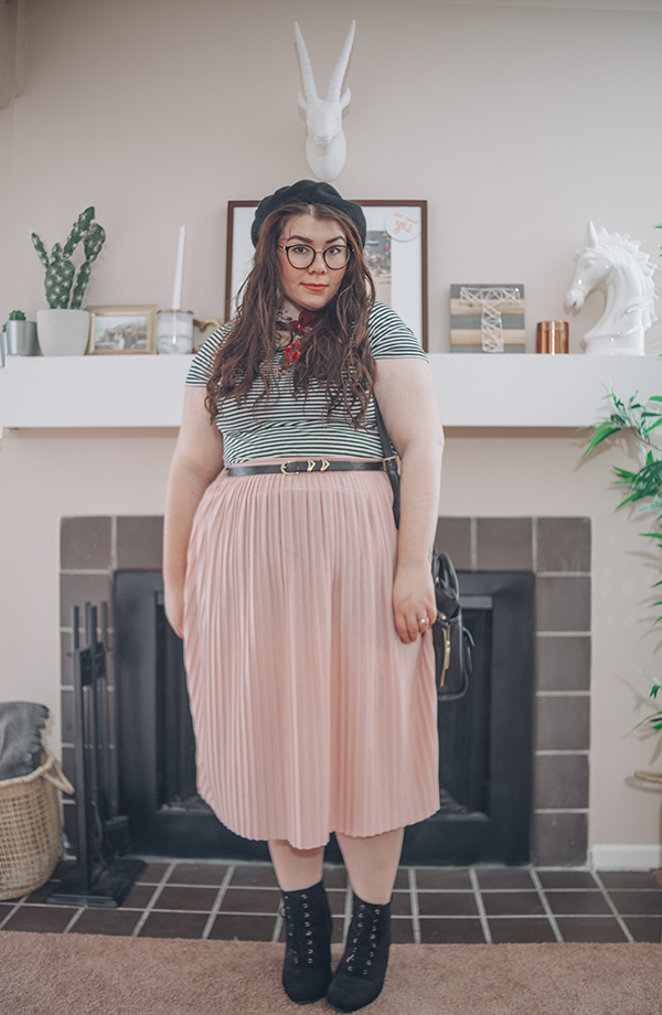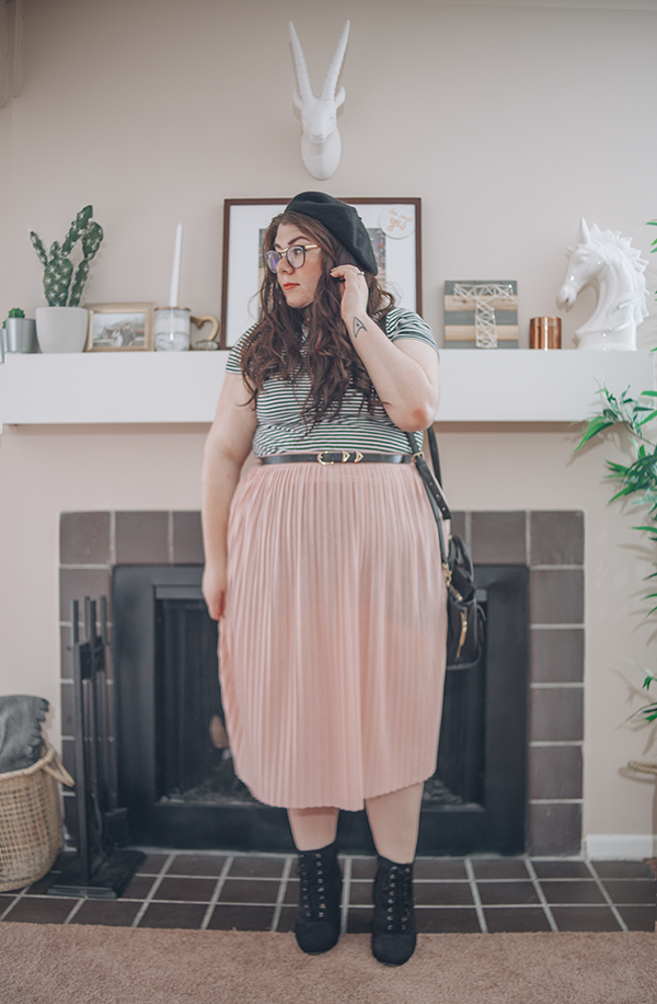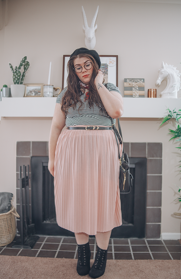 Stripes are my underrated pattern of choice. They are not in any form underrated in the real world, but in my style world, I'm a floral and polka dots kinda gal. It's every few years that I fall in love with striped again and act like no one else is giving them the respect they deserve, when I know it's quite the contrary. I paired this tried and true old tee with another tried and true pleated skirt for a semi-French inspired look. I added a floral neck tie and of course, a beret, to complete the so not French look.